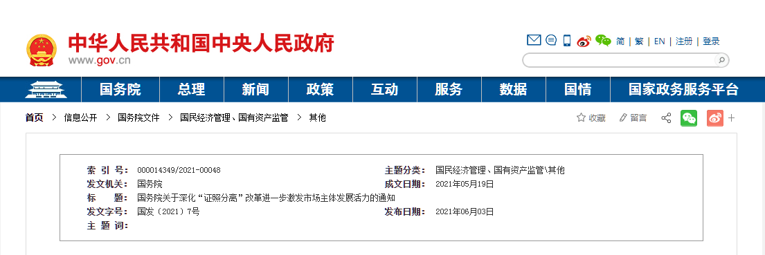 國務院關于深化“證照分離”改革 進一步激發(fā)市場主體發(fā)展活力的通知