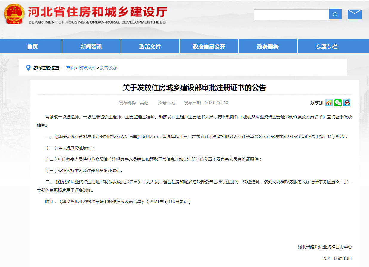 昨日河北住建廳發(fā)布:關于發(fā)放住房城鄉(xiāng)建設部審批注冊證書的公告